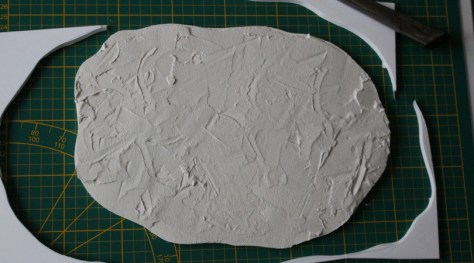 Une fois la plaque découpée, j’ai appliqué de l’enduit pour lui donner une texture. Vous pouvez réaliser beaucoup de motifs différents, de la glace pour Hoth, du plastobéton pour Coruscant par exemples. J’ai choisi un motif proche de Mos Eisley, le sable des dunes de Tatooine balayant le sol de la ville. Laissez sécher une dizaine de minutes environ, ça vous laissera le temps de vous attaquer à une autre pièce.