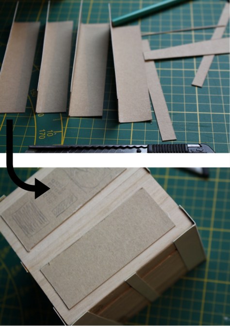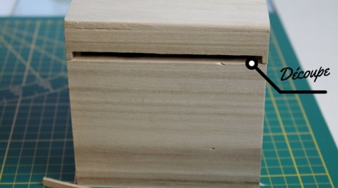 Pour la caisse de jouets, j’ai opté pour une simple boite de balsa que je vais customiser pour l’occasion. Découpez les guides du couvercle et de la base pour faire un ajour vous aurez ainsi votre glissière de cagnotte.
