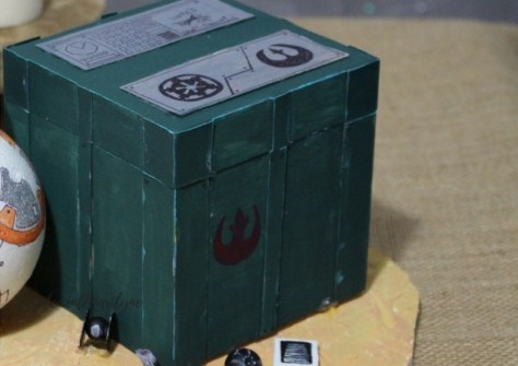 Laissons ce charmant droïde à ses occupations et revenons vers le coffre-cagnotte. Une teinte verte et du gris feront l’affaire, le gris faisant un rappel à ce qu’on peut rencontrer dans la saga de Georges Lucas et le vert pour le côté plus traditionnel de nos caisses de munitions. Les arêtes de la caisse recevront un brossage à sec (prenez un peu de peinture avec le pinceau et frottez la sur un papier ou de l’essuie-tout), cette technique permet de teinter par touches moins pigmentées. Ajoutez quelques détails comme les emblèmes des rebelles ou de l’empire pour symboliser l’éternelle lutte entre les 2 côtés de la force.