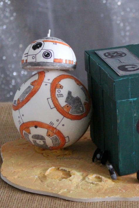 Le temps que le socle et le coffre sèchent, je vous propose d’attaquer notre personnage. Une boule de polystyrène de 10cm de diamètre, un compas et une bonne dose de patience seront nécessaires pour les motifs de BB-8. Que la force soit avec vous! Aidez-vous de la ligne de moulage pour créer les cercles, dessinez ensuite des motifs à partir d’un « portrait » de cette célébrité.