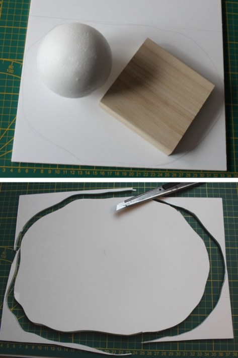 Commençons par définir les contours de notre scénette qui représentera BB-8 ayant découvert le coffre à jouets de la famille Skywalker. Je place le couvercle de ma boite de balsa et le « corps » du futur BB-8 sur la plaque de carton mousse pour délimiter le diorama.