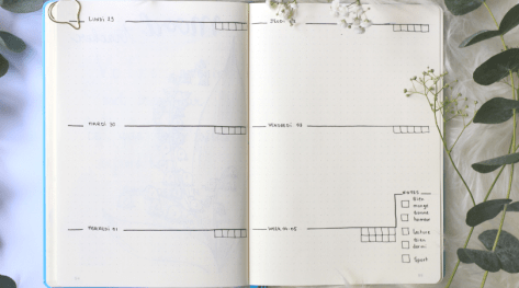 Sur une double page, le plus gros des changements ce sont ces petites cases au bout de chaque jour. Je vous explique. J’ai retiré mon habit tracker. Bien que j’aime remplir ses petits ronds et avoir cette vue globale à la fin du mois, je voulais un peu de changement.